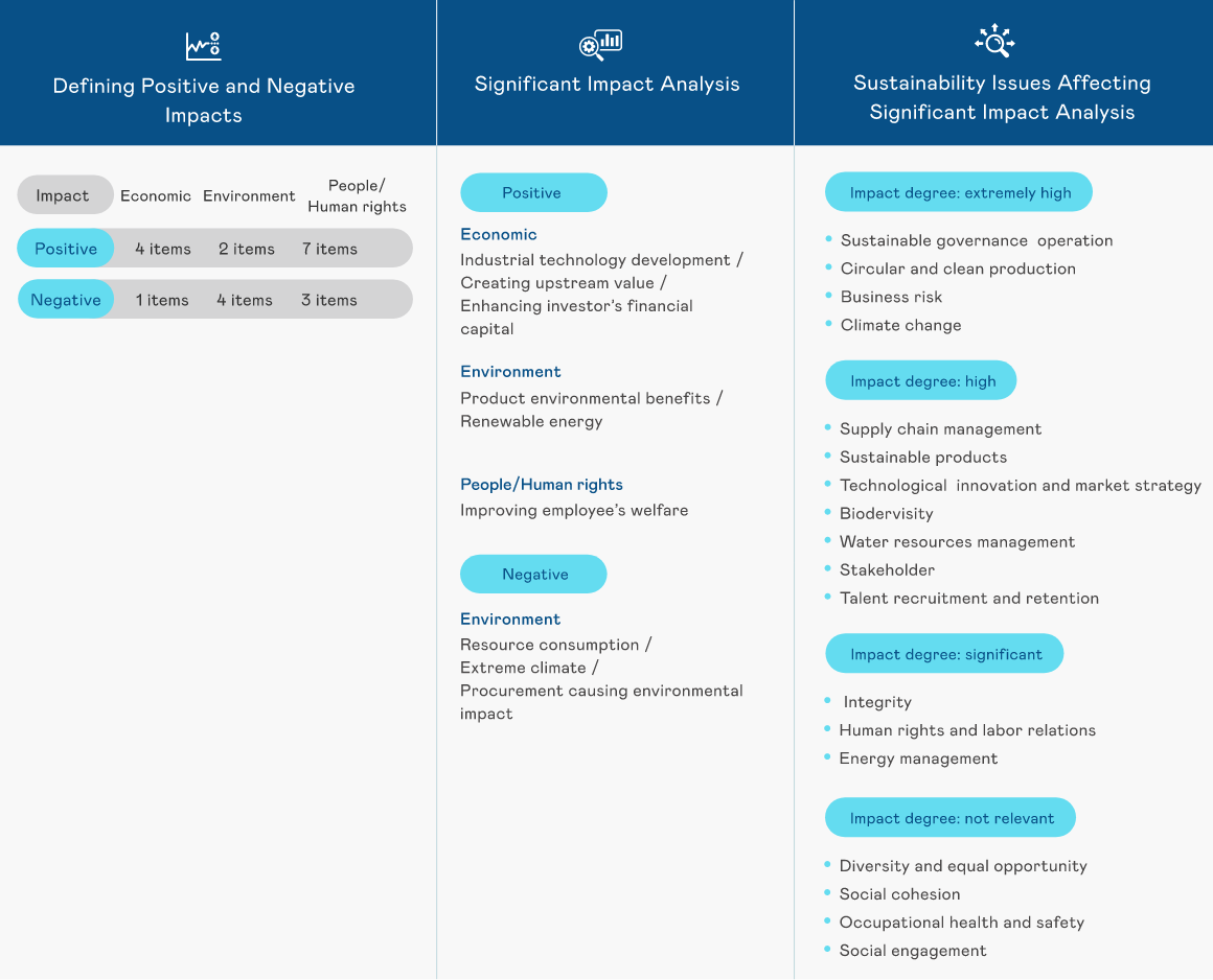 | Revenue Growth | Customer Satisfaction | Operating Risk | Employee Cohesion | Industry Technology Development(Positive) | Creation of Upstream Value(Positive) | Investor Financial Capital(Positive) | Environmental Benefit of Product(Positive) | Increase in Renewable Energy(Positive) | Improvement of Employee Life and Welfare(Positive) | Consumption of Energy Resource(Negative) | Environmental Impact of Purchasing(Negative) | Extreme weather (Negative) | ||